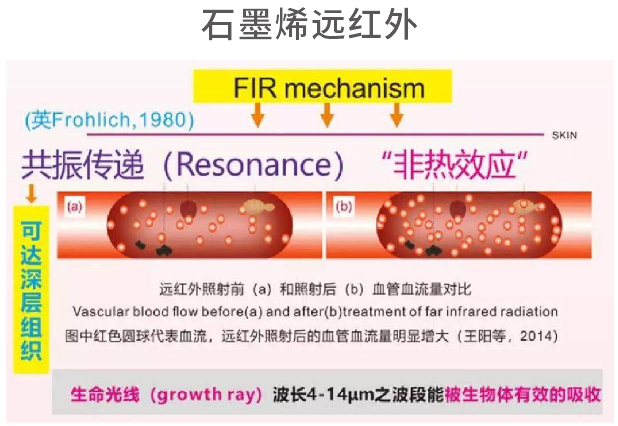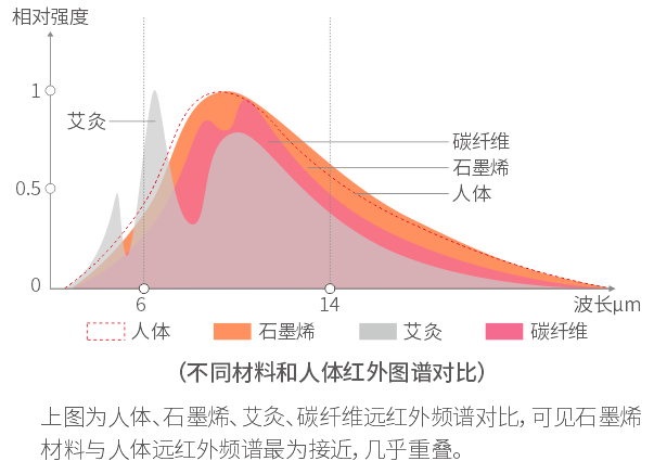【一】石墨烯发出的远红外谱图和人体的红外线谱图有着相似的谱图特征,易被人体吸收,并引起生命物质分子共振,传递能量。通过石 墨烯的这种特性对人体组织的作用,促进血液循环,改善微循环,促进新陈代谢,提高机体免疫能力。