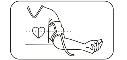 d) 将双手臂平放在桌面上,掌心向上,身体坐直,并使袖带中心与心脏位置处于同一高度,同时请注意袖带上的橡胶导气管无扭曲或打折。